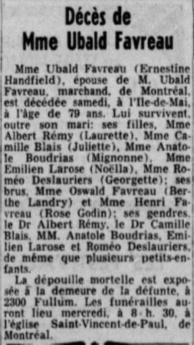 Décédée à l'Ile-de-Mai, Montréal. Funérailles le 13 août à l'église St-Vincent-de-Paul Montréal.