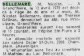 Au Centre d'hébergement Laflèche de Grand-Mère, le 11 mars 2002, est décédée à l'âge de 89 ans et 9 mois, Mme Thérèse Gélinas-Bellemare, épouse de feu Nicolas Bellemare, demeurant à Grand-Mère. |