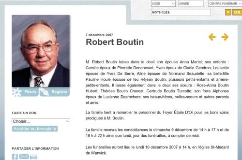 Robert (fils d'Ibrahim) Boutin est né le 17 juillet 1920 à Warwick Qc. Son père Ibrahim avait 35 ans et sa mère Mélanie avait 32 ans. Il a épousé Anna (fille de Xiste) Martel le 23 juin 1943 dans sa ville natale. Ils ont eu six enfants, trois garçons et trois filles. Il est décédé à Warwick Qc, le 7 décembre 2007 à l’âge de 87 ans. Il a été inhumé dans ...< plus >...