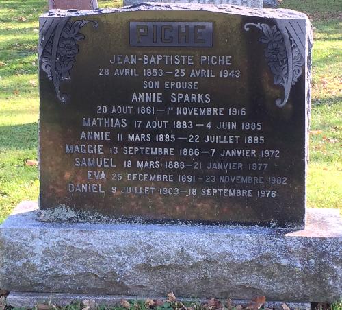 Pierre tombale de JB Piché et Annie Sparks au cimetière Belle-Rivière de Ste-Scholastique. Photo prise le 13 octobre 2014.