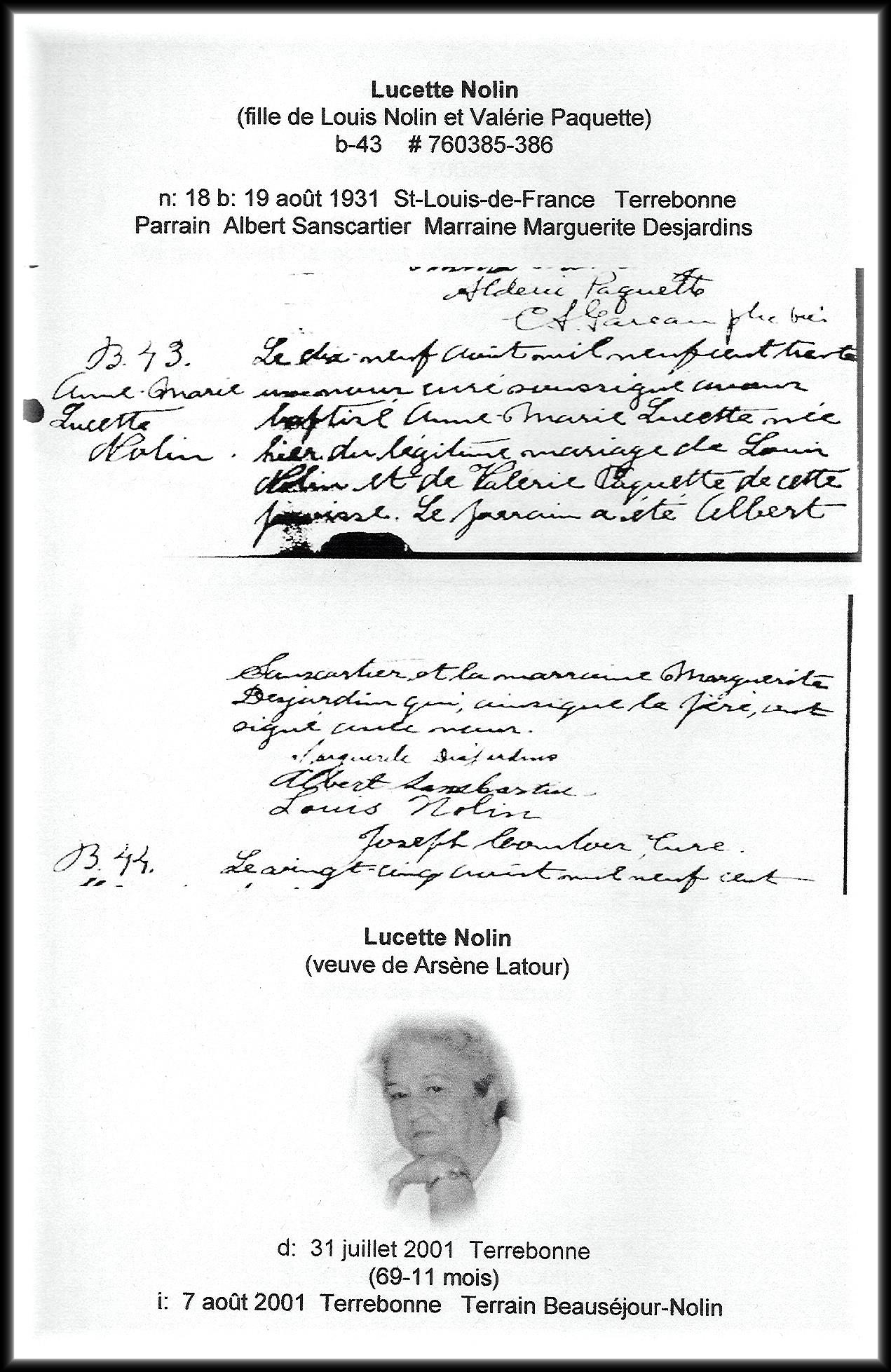 Ma mère Lucette (Nolin) est née le 18 août 1931 à Terrebonne, et est décédée le 31 juil 2001 à Terrebonne. Le 28 mai 1949 à Terrebonne, ellle a épousé mon père Arsène Latour, fils d'Ulric Latour et Laura (St-Onge). Ma mère est la seule de sa famille qui est née à la maison familiale des Nolin située au 238 rue St-Joseph.