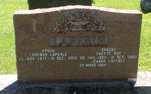 Pierre tombale de Lorenzo Laperle et Yvette Roy au cimetière de St-Ours. Photo prise le 25 juin 2015.