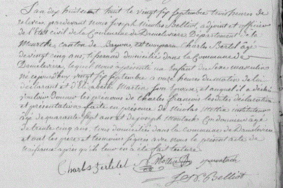 L’an dix huit cent huit le vingt six septembre trois heures de relevées par devant nous Joseph Nicolas Belliot, adjoint et officier de l’État civil de la Commune de Damelevières, Département de la Meurthe, canton de Bayou, est comparu Charles Bertel âgé de vingt-cinq ans, tisserand domicilié dans la Commune de Damelevières, lequel nous a présenté un enfant du sexe masculin né cejourdhui vingt-six septembre à onze heures du matin de lui déclarant et d’Elisabeth Martin son épouse, et auquel il a déclaré vouloir donner les prénoms de Charles François lesdites déclarations et présentations faites en présence de Nicolas Mottin instituteur âgé de quarante-sept ans et de Joseph Montack Cordonnier âgé de trente-cinq ans, tous domiciliés dans la Commune de Damelevières et ont les père et les témoins signées (sic) avec nous le présent acte de naissance après qu’il leur en a été fait lecture.