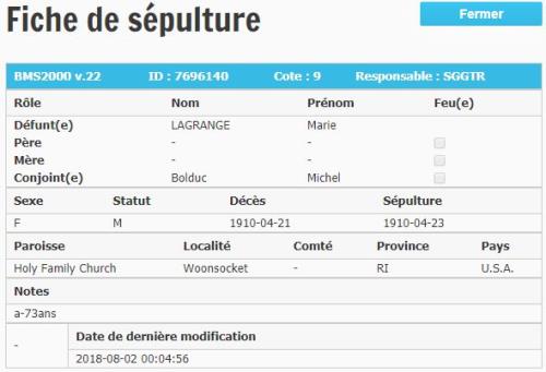 Résumé des naissances, mariages, et décès de Marie Lagrange, Michel Bolduc, Elie Souliere, Majorique Gagne, Adele Belanger et Virginie Chaloux.