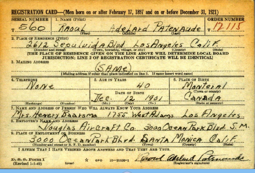 Voici le Census 1940 pour Raoul. Il est dit célibataire, né à New York (probablement son lieu d’entrée aux U.S.A….) et Tool Maker in aircraft industry. On y indique également sa résidence en avril 1935 soit Detroit, Wayne, Michigan. À la ligne 64, on retrouve Henry Baarsma, référence donnée sur sa Registration Card.