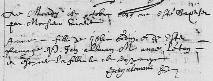 Acte de baptême d'Anne Godin, le 18 octobre 1639,