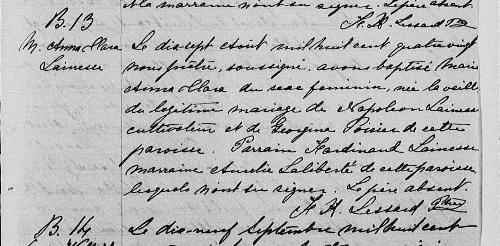 Le dix-sept août mil huit cent quatre-vingt nous prêtre, soussisgné, avons baptisé Marie Anna Clara du sexe féminin, née la veile du légitime mariage de Napoléon Lainesse cultivateur et de Georgina Poirier de cette paroisse. Parrain Ferdinand Lainesse marraine Aurélie Laliberté de cette paroisse, lesquels n'ont su signer. Le père absent.