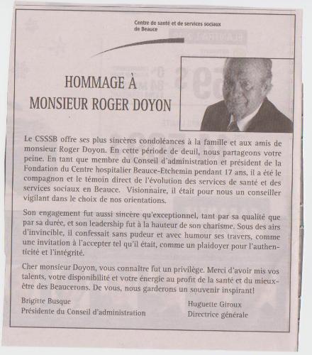 À l'Institut Universitaire de cardiologie et de pneumologie de Québec, le dimanche 7 novembre, à l'âge de 67 ans et 7 mois, est décédé, Maître Roger Doyon, époux de madame Hélène Jacques, fils de feu Jean-Marie Doyon et de feu Gertrude Nadeau.