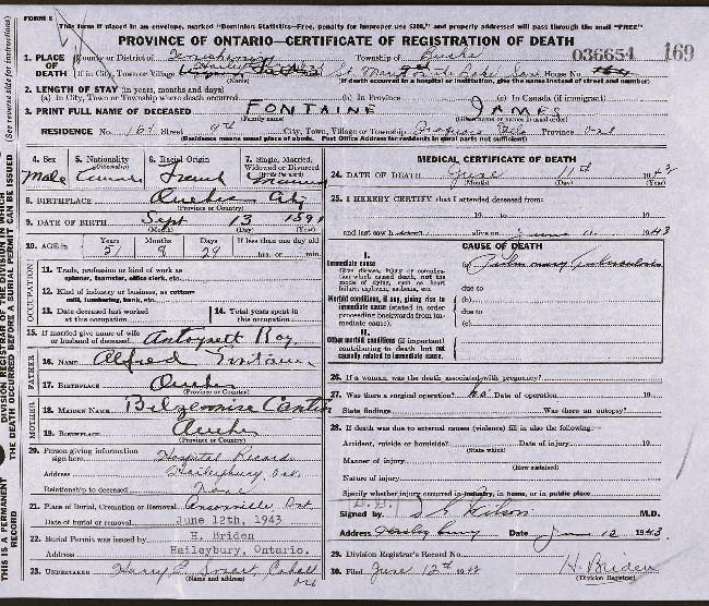 DEATH CERTIFICATE - JAMES FONTAINE - 1943